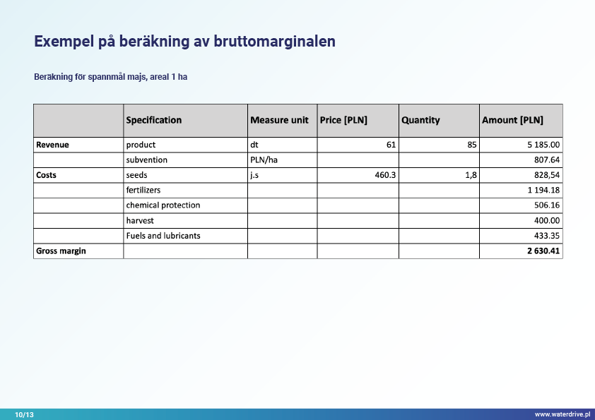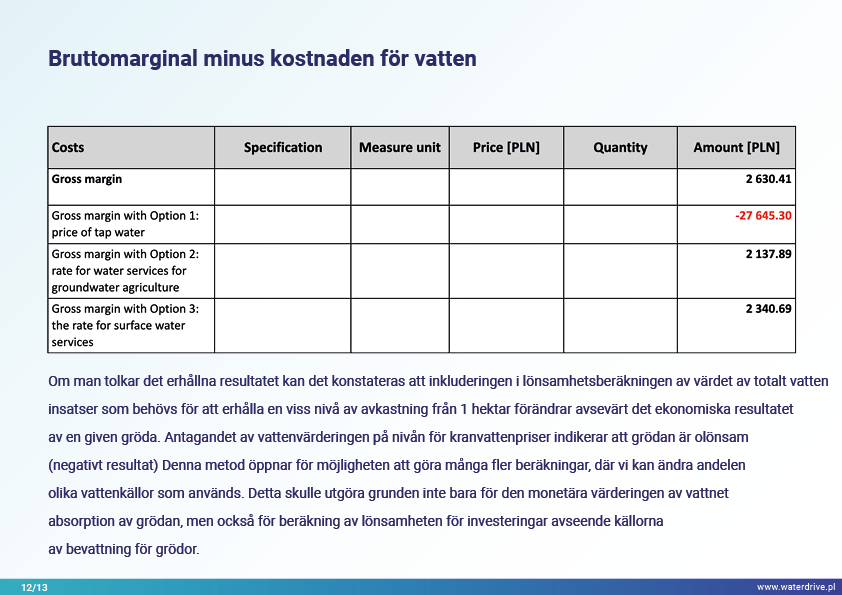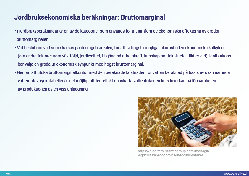 I presentationen identifierar vi möjligheter att minska växtodlingens vattenavtryck genom grönt (regnvattenanvändning), blått (vatten som hämtas från yt- och grundvatten för bevattning) och gråvattenfotavtryck (vatten som används för att späda ut föroreningar från jordbruket). Dessutom har ett sätt att inkludera jordbruksvatten i ekonomiska kalkyler genom att utöka det direkta överskottskontot till att omfatta den beräknade kostnaden för vatten föreslagits.
