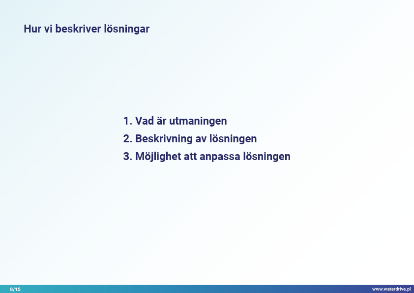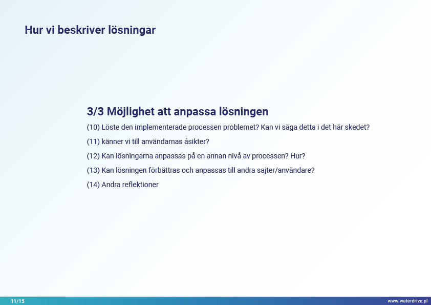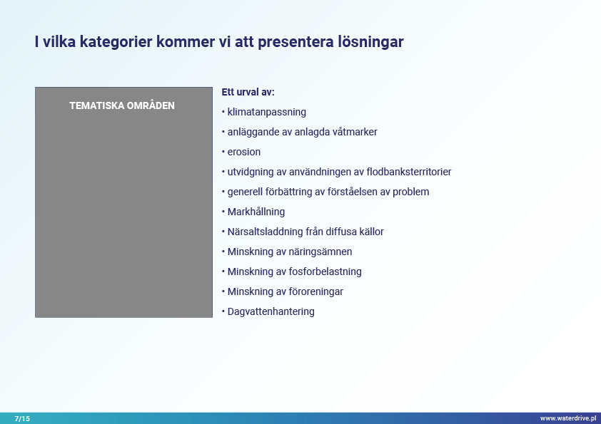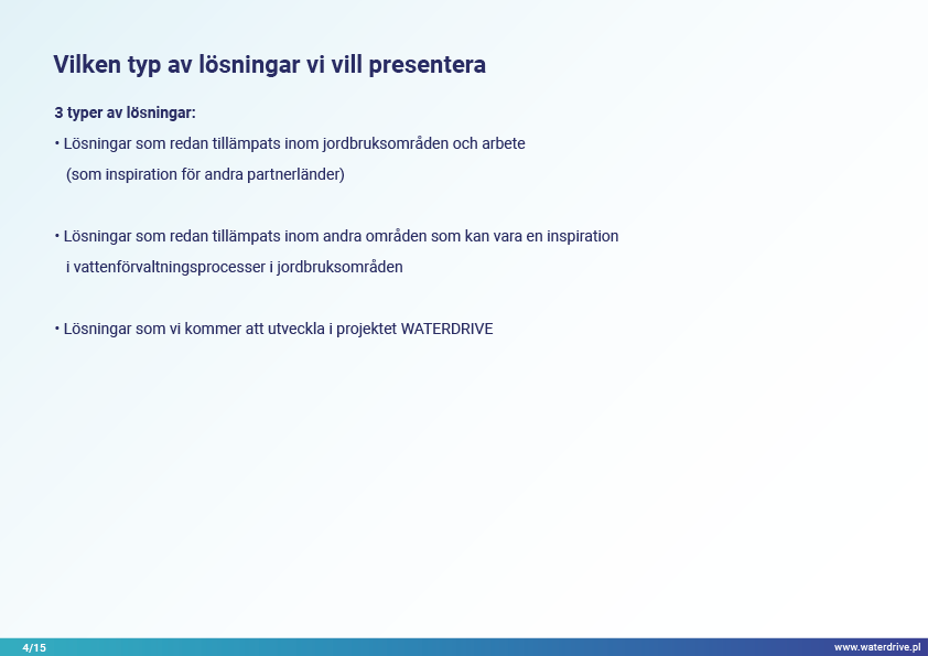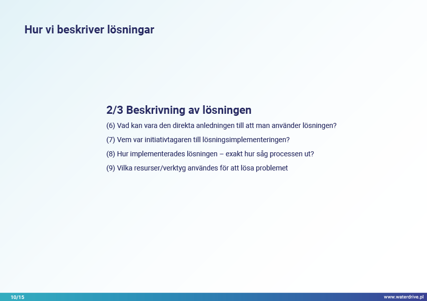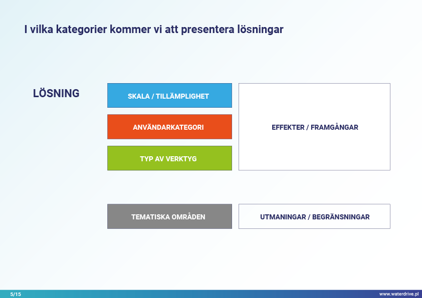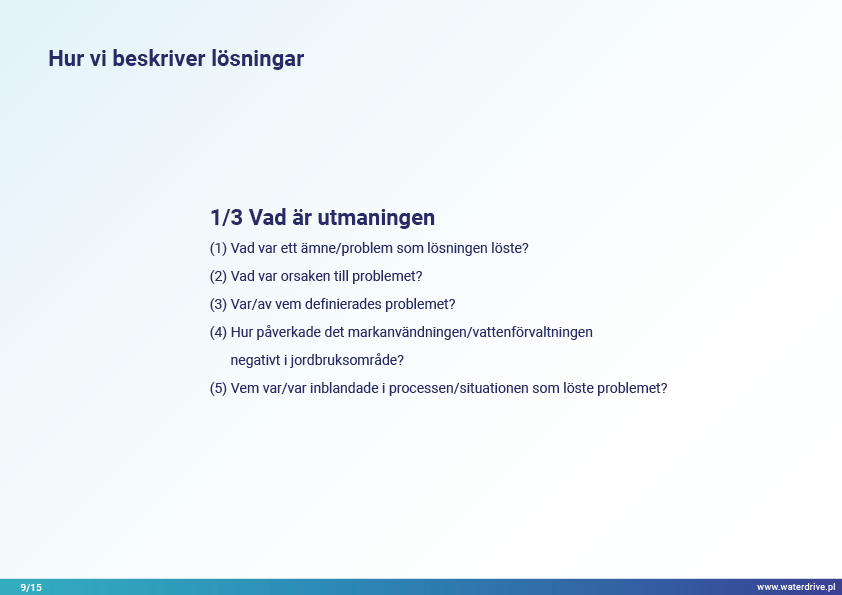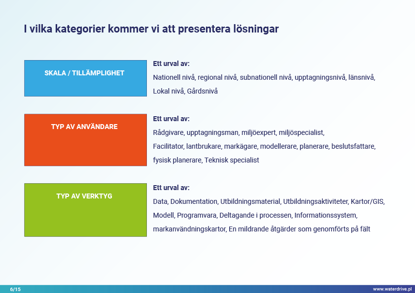 Lösningarna är baserade på exempel och täcker olika tematiska områden i processen för fysisk planering på jordbruksmark i samband med att uppnå de förväntade miljöindikatorerna relaterade till vattenförvaltning